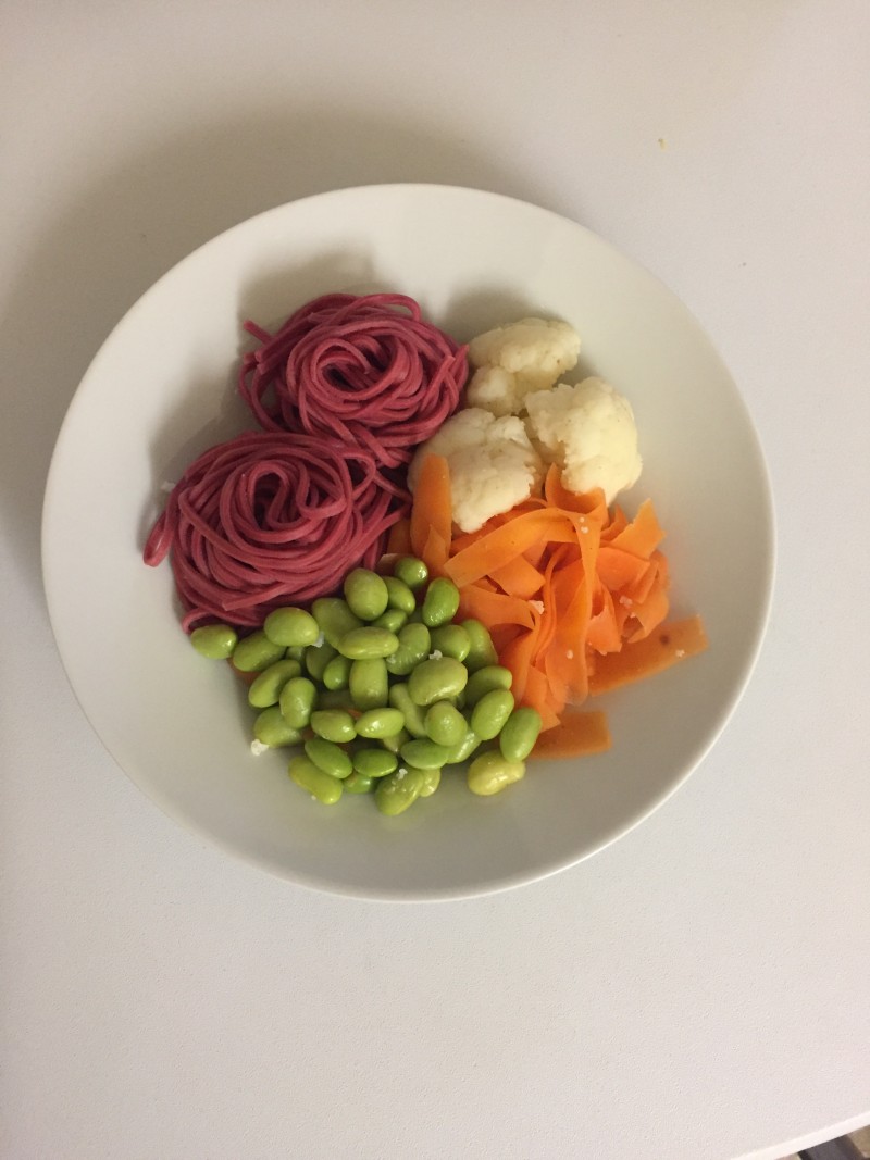 I’m really happy with my food choices for today. Particularly dinner. I had some beetroot noodles with edamame beans, cauliflower and carrots. Unfortunately I forgot to take a pic after I added the ginger and chilli dressing I put on top of it, so it looks like a bit of a dry meal. But it was freaking gorgeous.