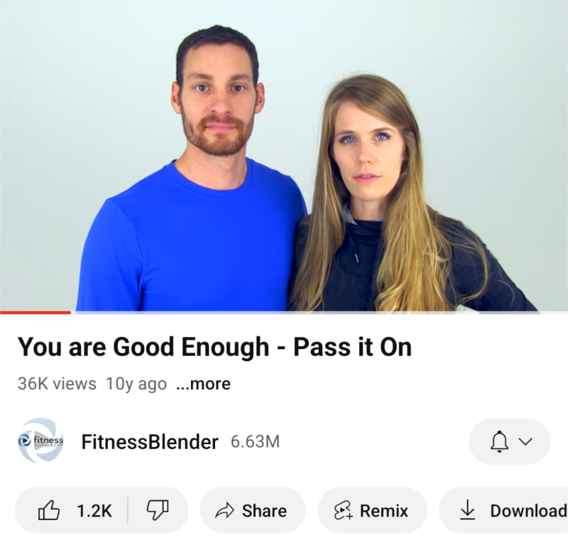 I watch it sometimes and it really picks me up, because it carries a message that has moved me since the first time I came across Fitnessblender 10 years ago and is the main point in their approach. It is there every time Kelli loses count or congratulates me for showing up, every time I hear "it's okay to take a break just start as soon as you can". This is what has kept me consistent with thinking of my physical and mental health, has helped me not be too hard on myself, always coming back to exercise and having fun with how it makes me feel. And so much more. So thank you!